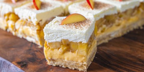 Prăjitură cu mere, cremă de vanilie și frișcă